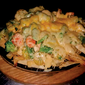 Pácolt, csíkokra vágott hús, zöldségek, Chedar sajttal átsütve, mellé avokádó, tejföl, babpüré, paradicsom és tortilla jár.