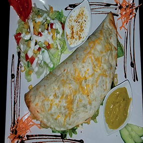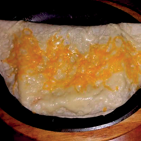 A friss tortillát csirke vagy marhahússal megtöltjük, házi szósszal leöntjük, Cheddar sajttal átsütjük, babpürével tálaljuk.